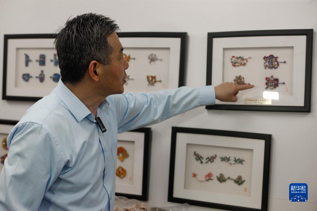5月31日,江满宗在上海市“龙凤旗袍制作技艺——国家级非物质文化遗产传习所”介绍盘扣。