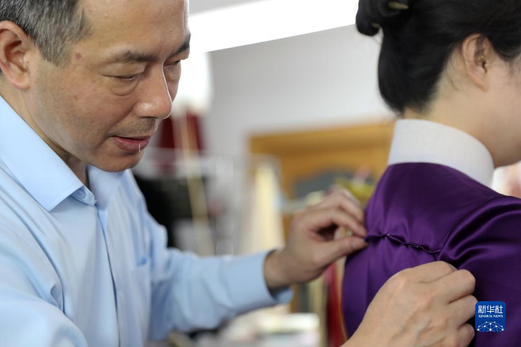 5月31日,江满宗(左)在上海市“龙凤旗袍制作技艺——国家级非物质文化遗产传习所”为顾客测量身材尺寸。