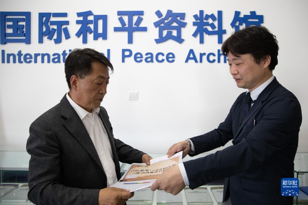 6月1日,日本学者松野诚也(右)将影印资料赠予侵华日军第七三一部队罪证陈列馆馆长金成民。