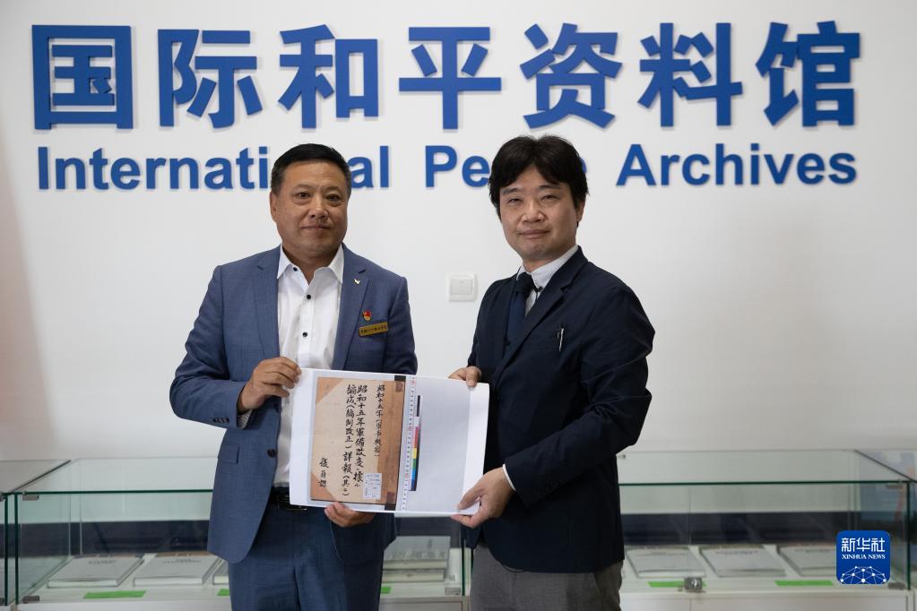 6月1日,日本学者松野诚也(右)将影印资料赠予黑龙江外国语学院国际和平资料馆。