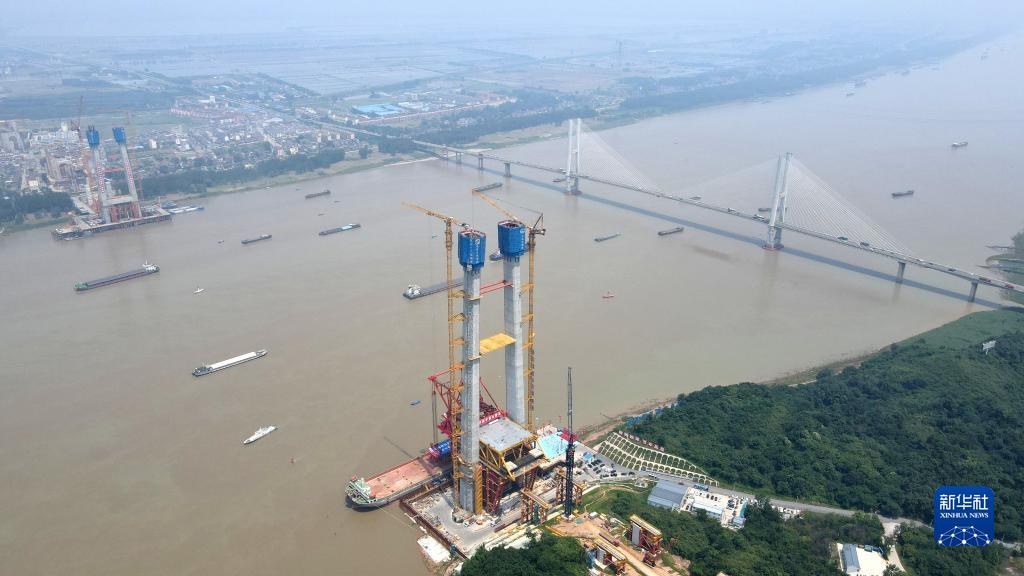 6月2日拍摄的封顶后的京台高速铜陵长江公铁大桥4号主塔(画面正中)(无人机照片)。