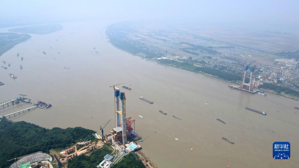 6月2日拍摄的封顶后的京台高速铜陵长江公铁大桥4号主塔(画面左侧)(无人机照片)。