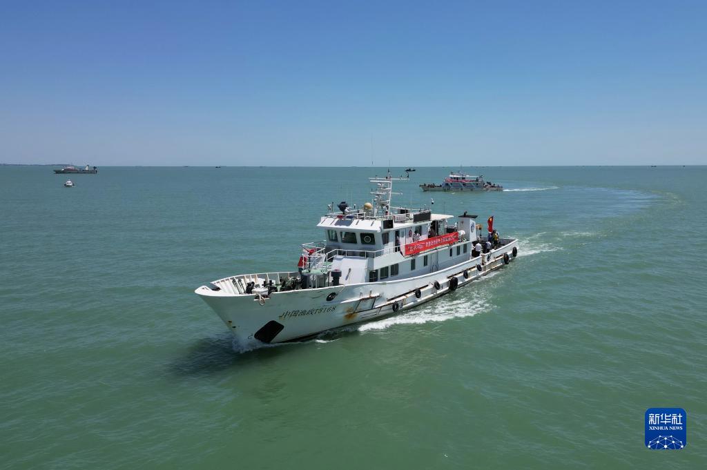 6月2日,参加增殖放流活动的船只向秦皇岛市北戴河新区海洋渔业资源增殖放流基地海域航行(无人机照片)。
