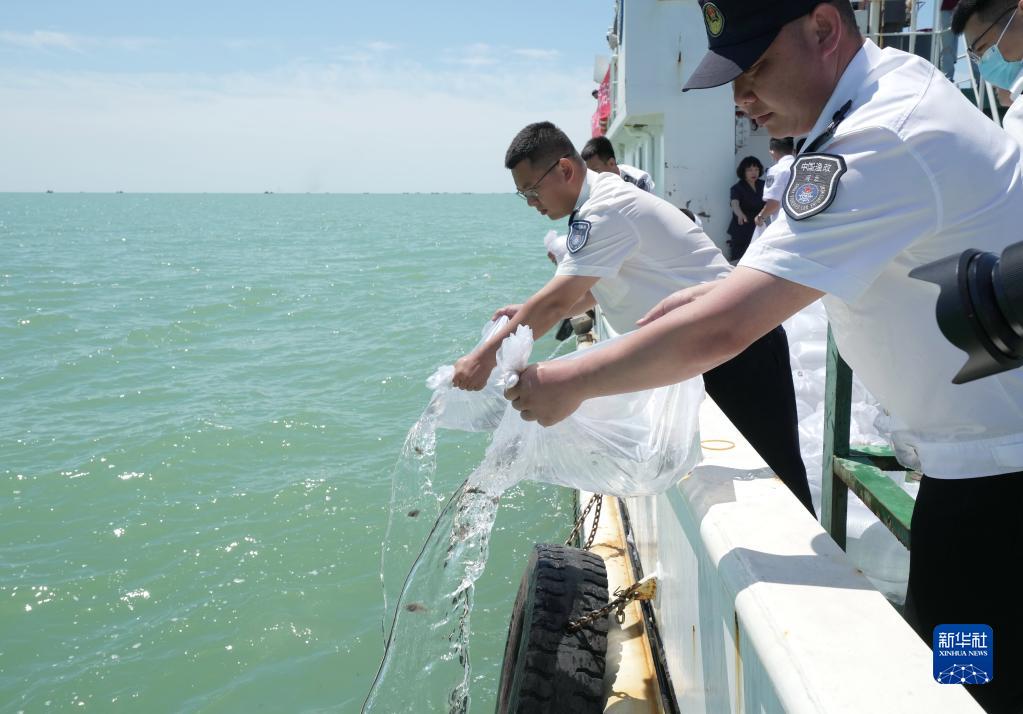 6月2日,参加增殖放流活动的人员在秦皇岛市北戴河新区海洋渔业资源增殖放流基地海域投放鱼苗。