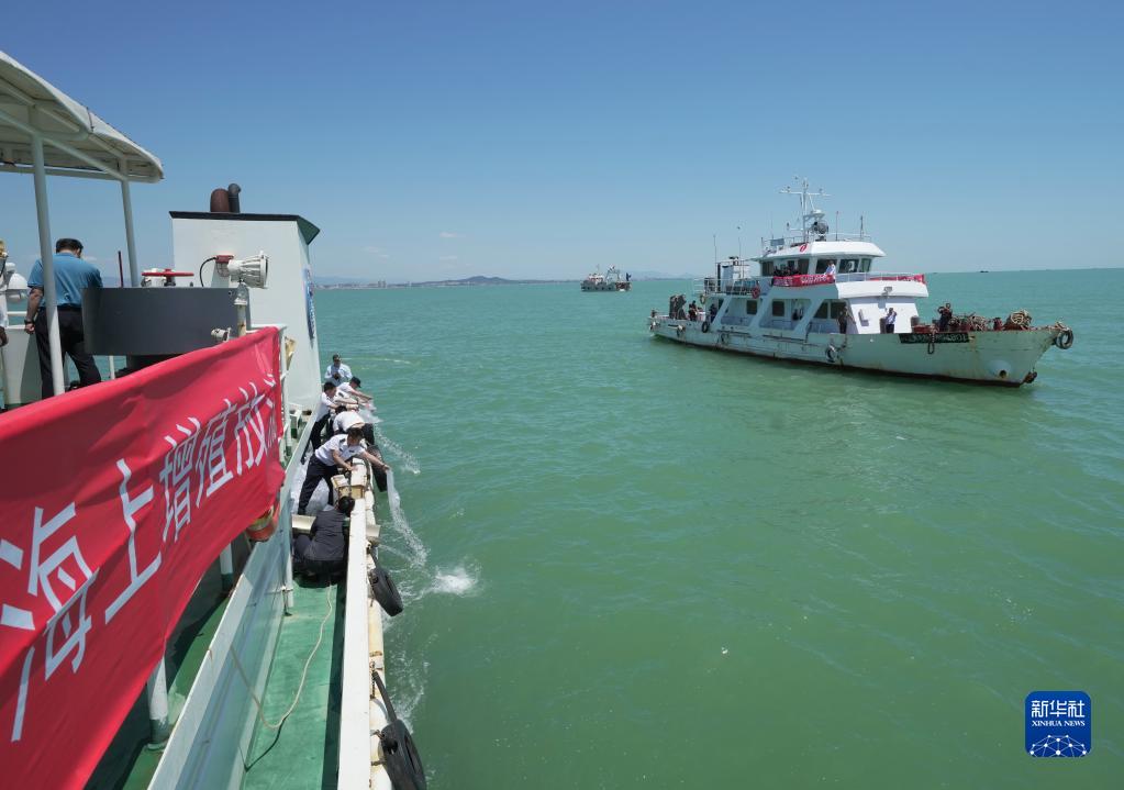 6月2日,参加增殖放流活动的人员在秦皇岛市北戴河新区海洋渔业资源增殖放流基地海域投放鱼苗。