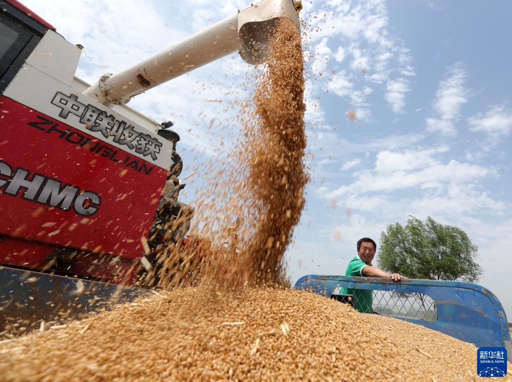 6月2日,在安徽省亳州市蒙城县小辛集乡芡河村,农民从收割机上卸下刚收获的小麦。
