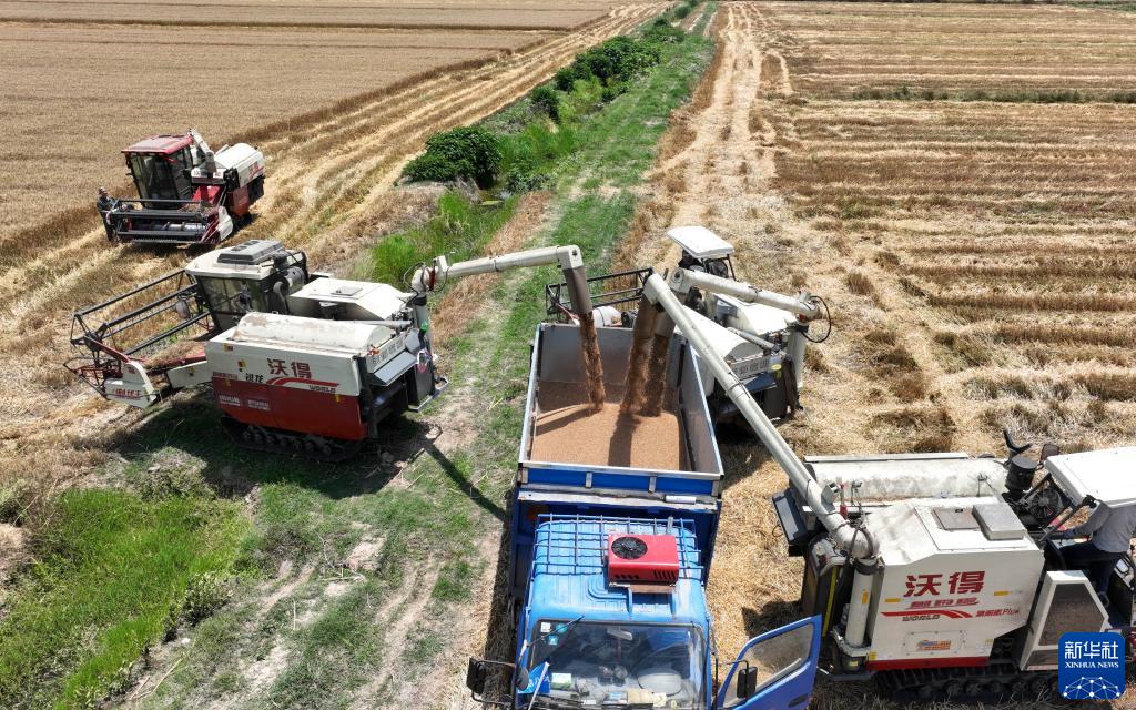 6月2日,在江苏省淮安市洪泽区三河镇草桥村麦田里,农民驾驶收割机将小麦装车(无人机照片)。