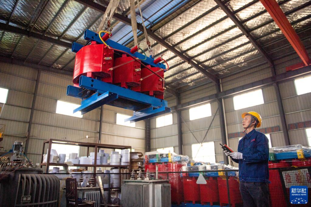 6月2日,在位于娄底经开区的湖南乐立保电气有限公司,工人在吊装变压器。