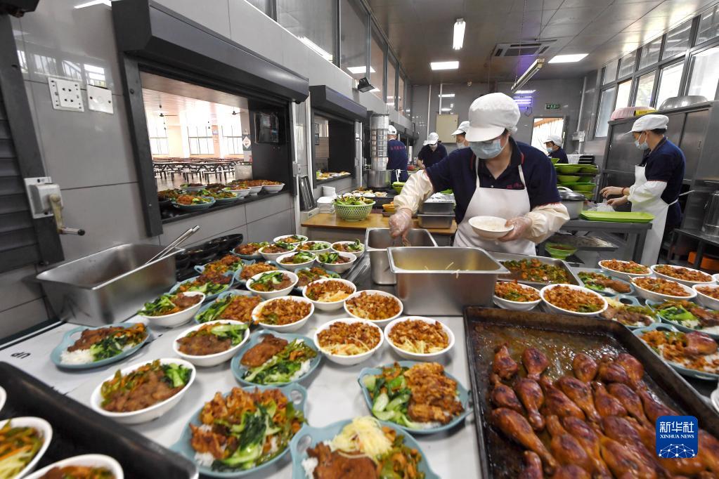 6月2日,食堂师傅在南京市第九中学食堂为学生配制营养餐。