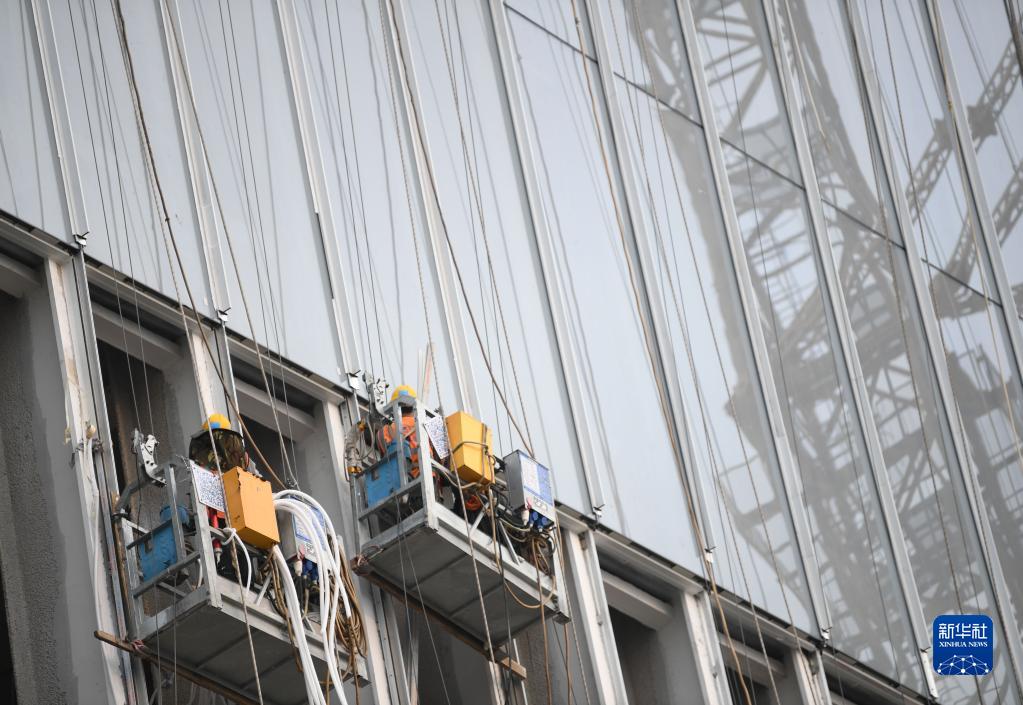 6月2日,工人在白鹅潭大湾区艺术中心进行幕墙施工。
