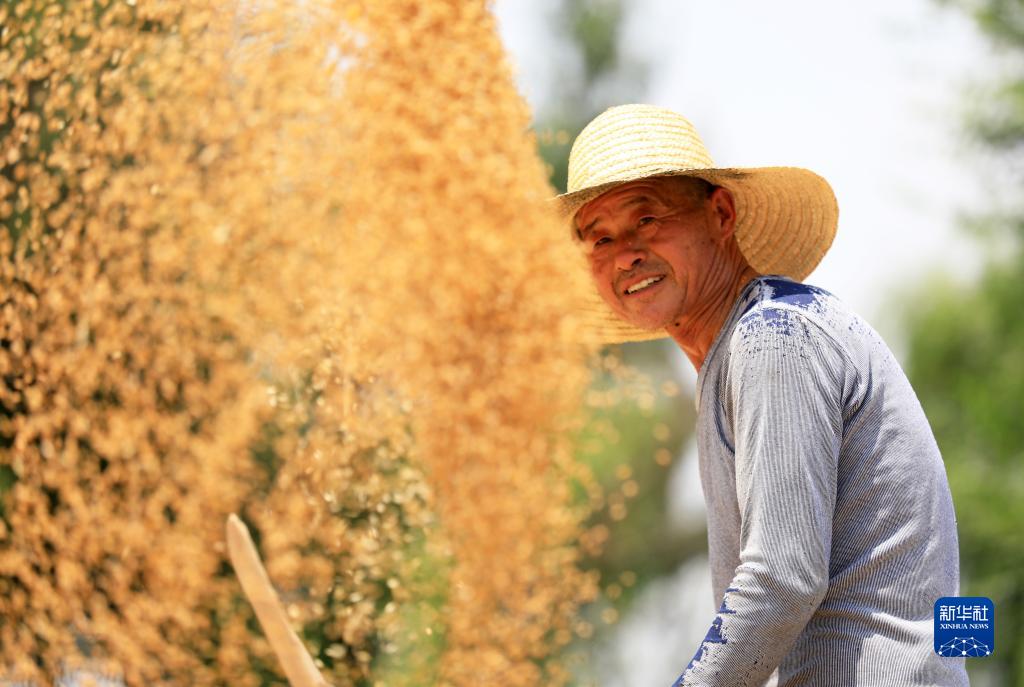 6月3日,安徽省淮北市烈山区古饶镇谷山村村民在晾晒收获的小麦。