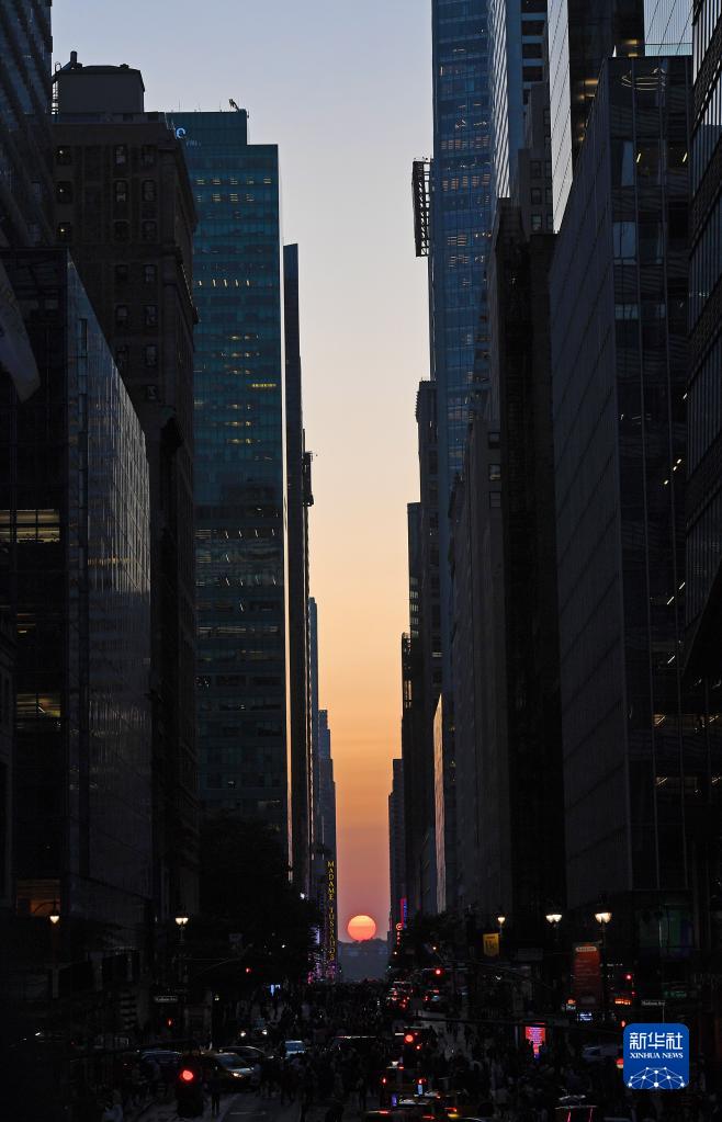 当日,纽约出现“曼哈顿悬日”景观。“曼哈顿悬日”是纽约市标志性景观,每年5月和7月出现两次,指日落时太阳正好出现在曼哈顿东西向街道正上方、似乎悬在两侧高楼大厦之间的戏剧性画面。