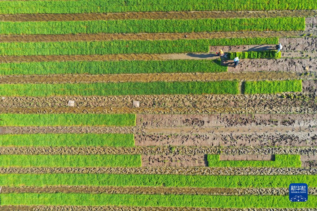 6月2日,山东青岛市即墨区蓝村街道清香水稻种植合作社的农民在搬运秧苗(无人机照片)。