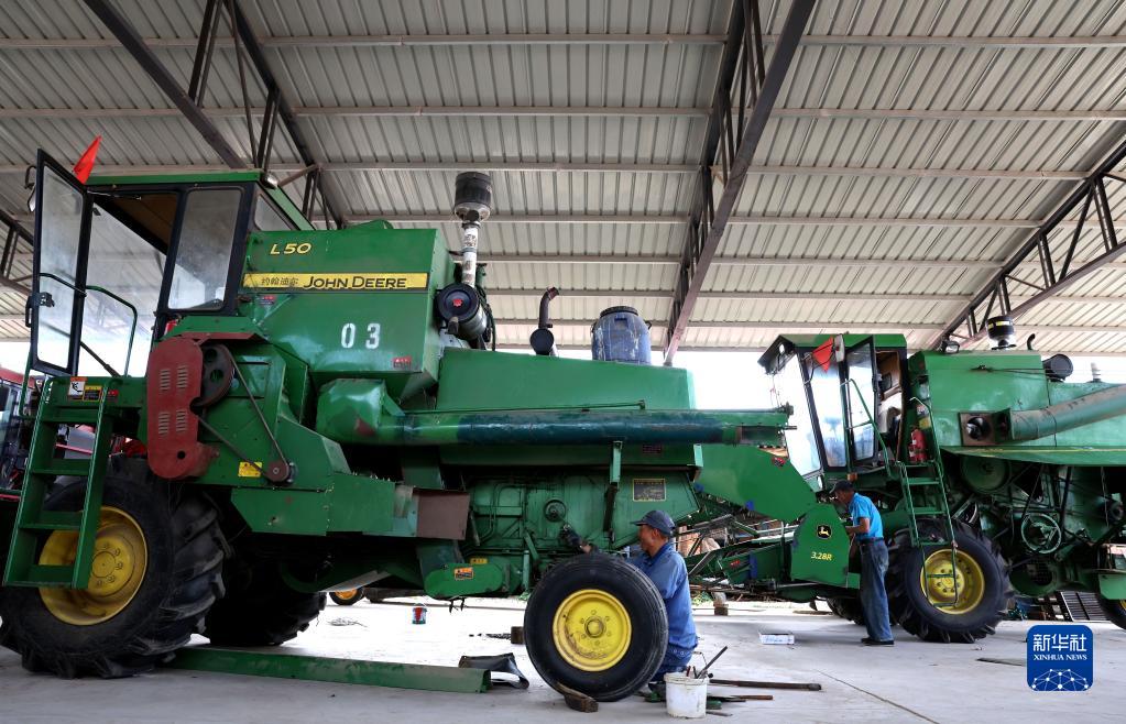 6月2日,在河北省晋州市周家庄乡,维修人员对即将“上岗”的农机进行检查维修。