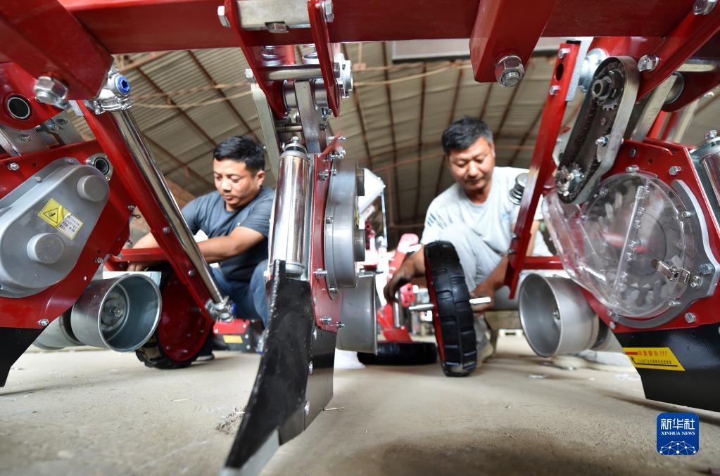 6月2日,在河北省石家庄市深泽县一家农机销售点,工作人员安装播种机。