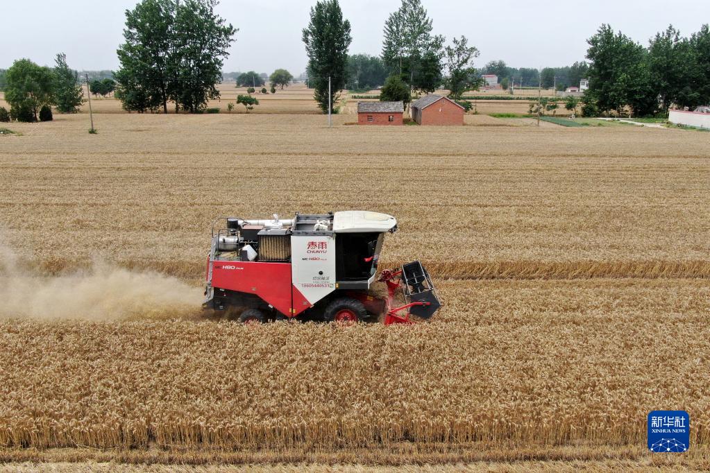 6月2日,在安徽省阜阳市阜南县许堂乡刘岗村,董斐斐驾驶收割机为村民收割小麦(无人机照片)。