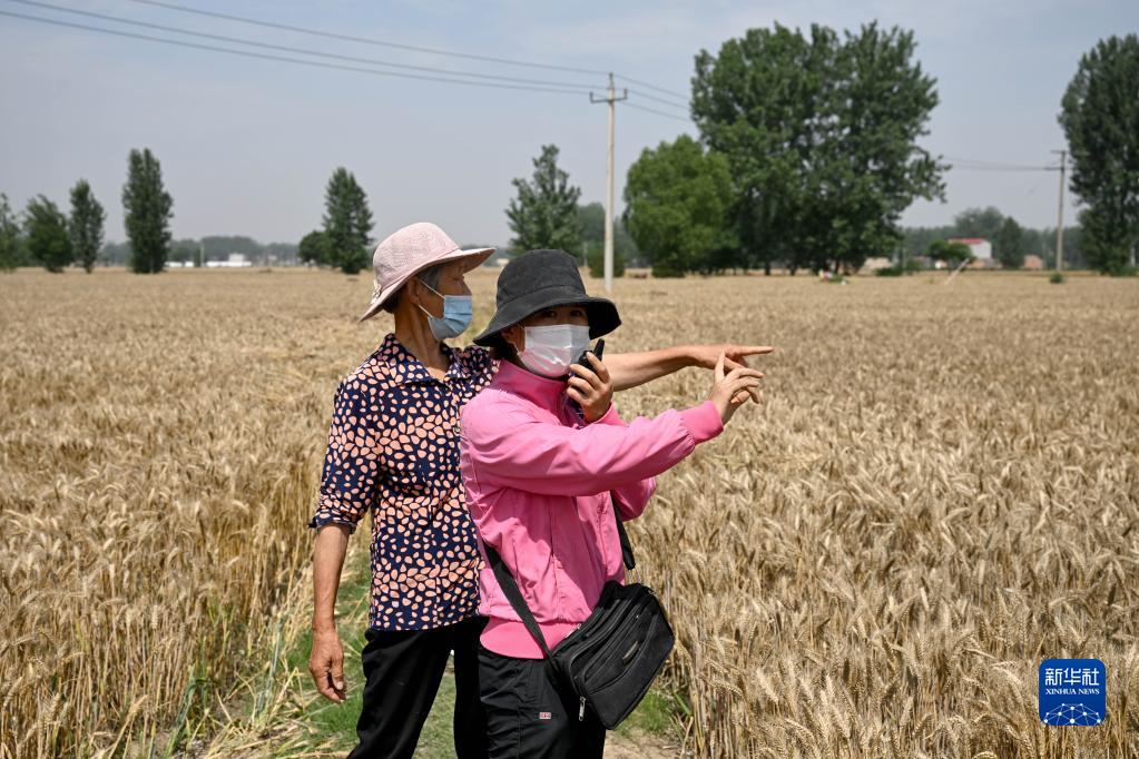 6月2日,在安徽省阜阳市阜南县许堂乡刘岗村,陈丽娟(前)和村民沟通田块地界。