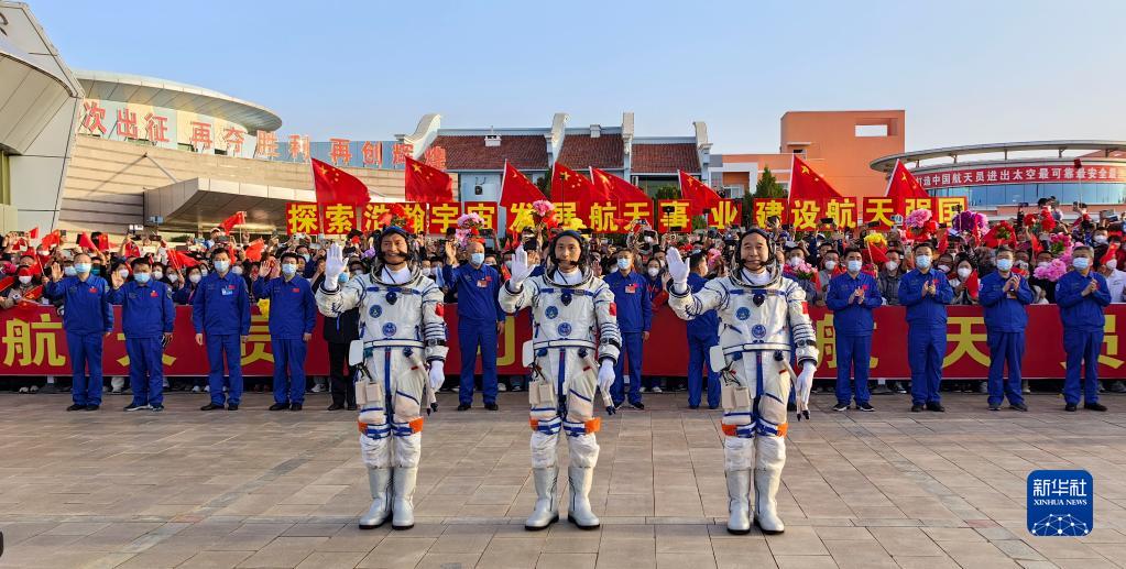 5月30日6时42分,神舟十六号载人飞行任务航天员乘组出征仪式在酒泉卫星发射中心问天阁圆梦园广场举行。这是航天员景海鹏(右)、朱杨柱(中)、桂海潮在出征仪式上。