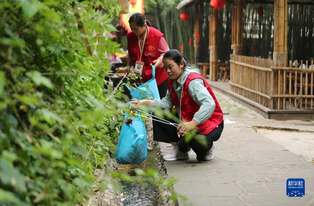 6月3日,在山东省临沂市沂南县竹泉村景区,参加志愿环保活动的志愿者在捡拾垃圾。