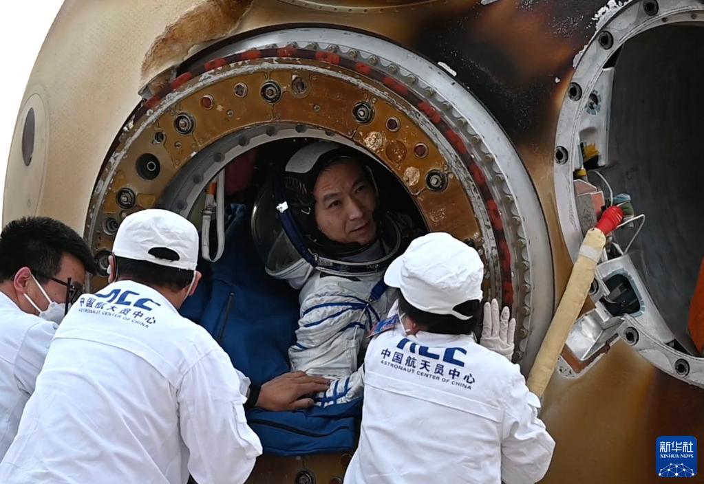 6月4日,神舟十五号载人飞船返回舱在东风着陆场成功着陆,神舟十五号载人飞行任务取得圆满成功。这是航天员费俊龙出舱时刻。新华社记者 贺书琛 摄