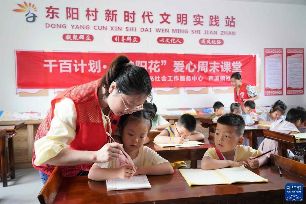 6月3日,江西省萍乡市芦溪县芦溪镇东阳村部分留守儿童在“爱心周末课堂”学习书法。
