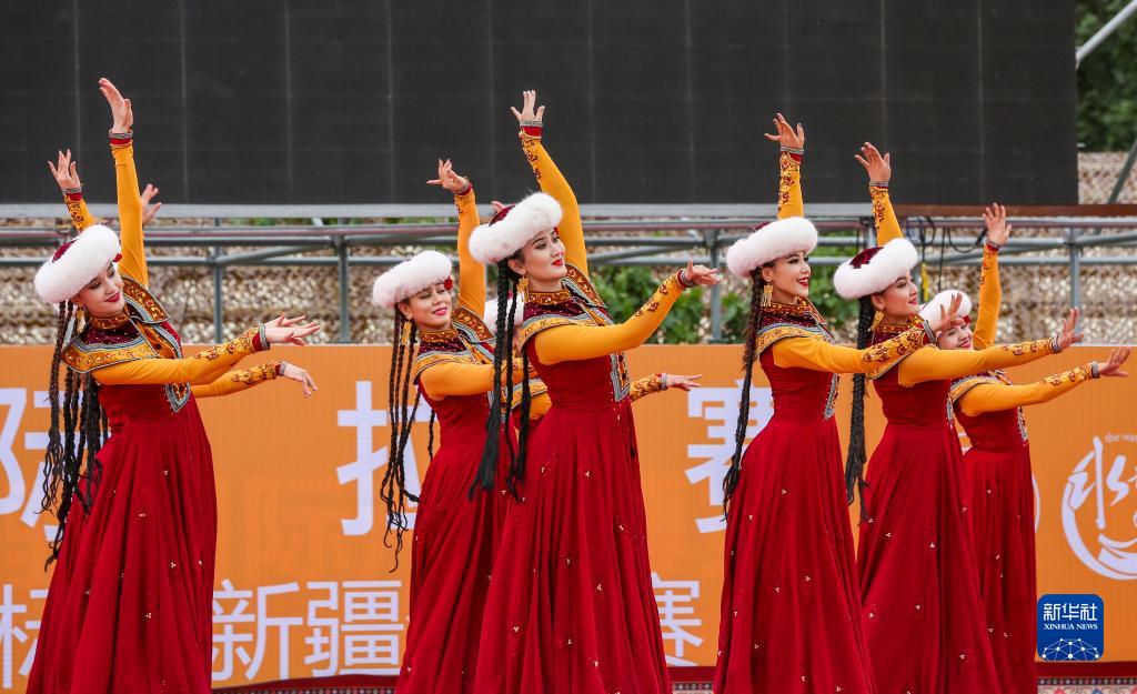 6月1日,在新疆和田地区大漠湖杨生态景区,歌舞演员在环塔拉力赛闭幕式上表演。