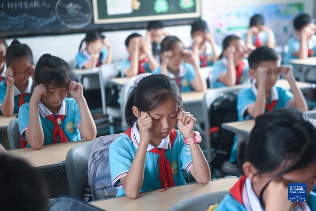 6月5日,东林小学的学生们在爱眼知识课上做眼保健操。