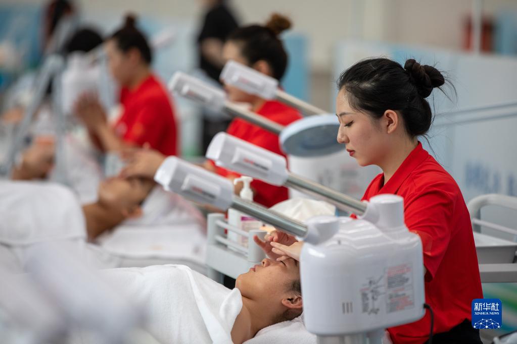 6月5日,在黑龙江省第一届职业技能大赛现场,选手在参加美容比赛。