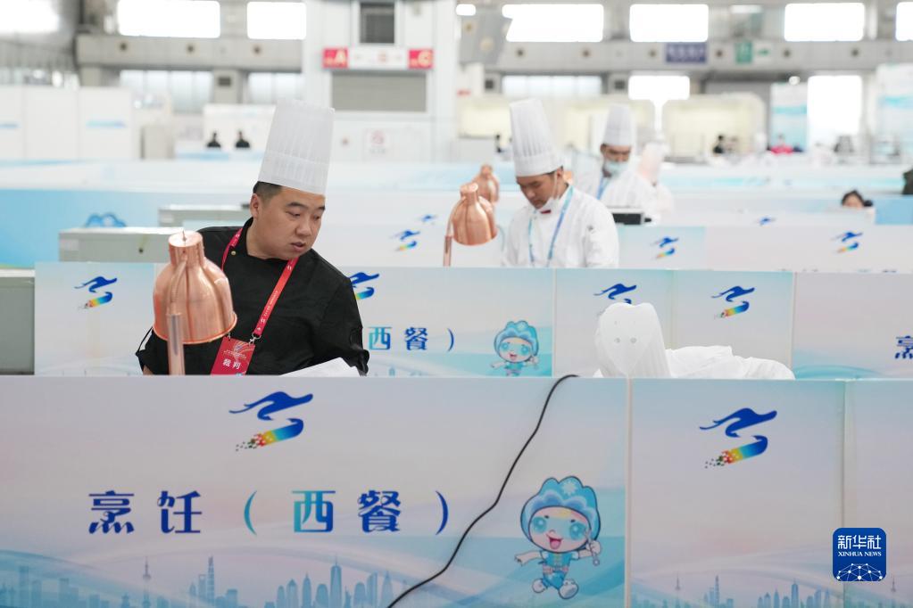 6月5日,裁判在烹饪(西餐)项目比赛现场观看选手比赛。