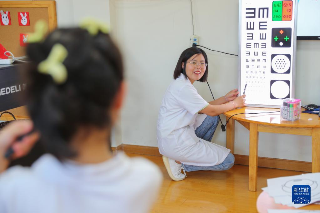 6月5日,在浙江省湖州市德清县武康街道伊顿幼儿园里,眼科医生在给小朋友检查视力。