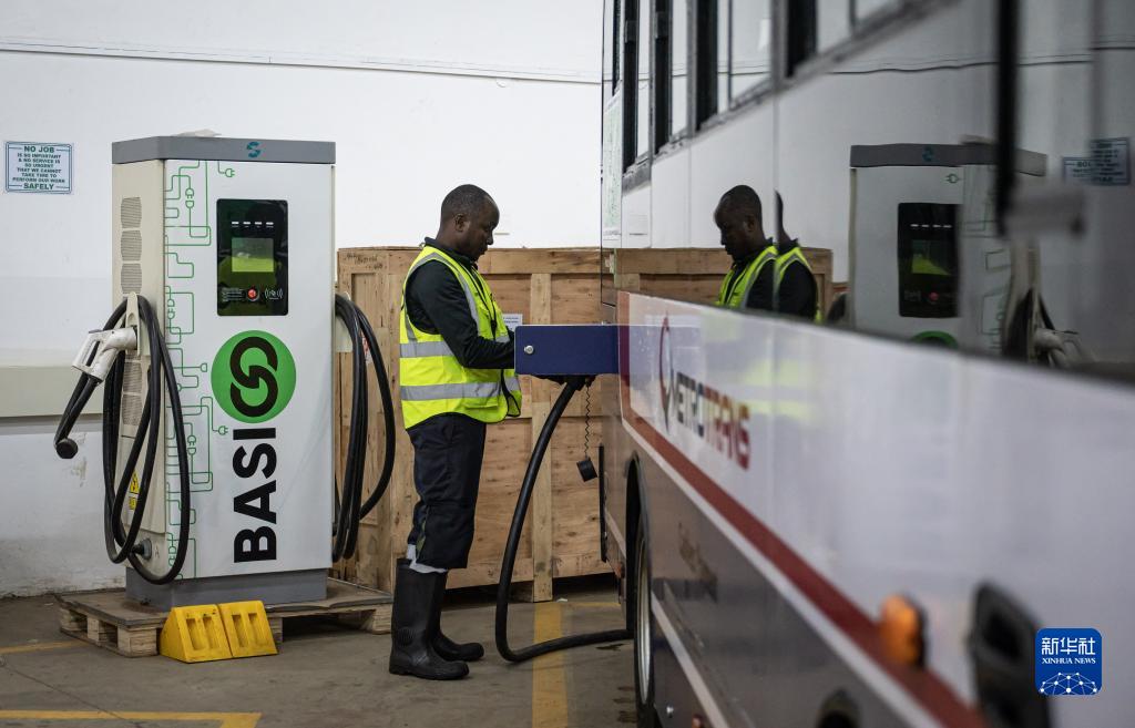 6月2日,在肯尼亚内罗毕,肯尼亚电动巴士公司工作人员为电动巴士充电。