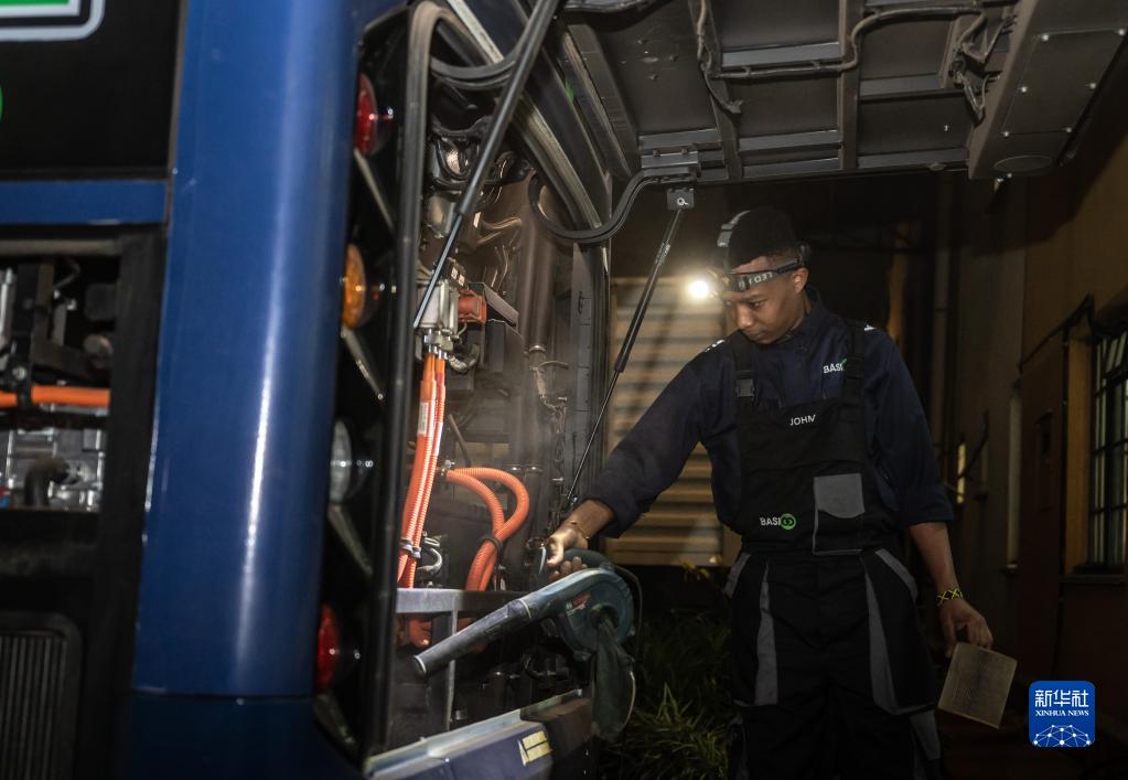 6月2日,在肯尼亚内罗毕,肯尼亚电动巴士公司工作人员为电动巴士除尘。