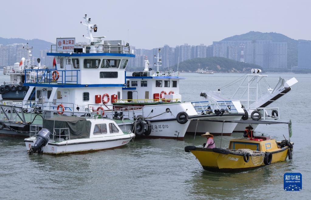 在厦门市西堤环卫码头,机械清扫船和小型保洁船舶准备执行海漂垃圾清扫任务(6月4日摄)。