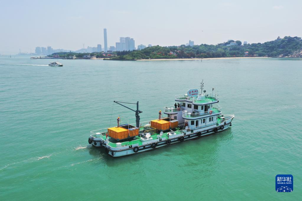 厦门海上环卫站“厦海环003号”海上环卫船行驶在厦鼓海域(6月4日摄,无人机照片)。
