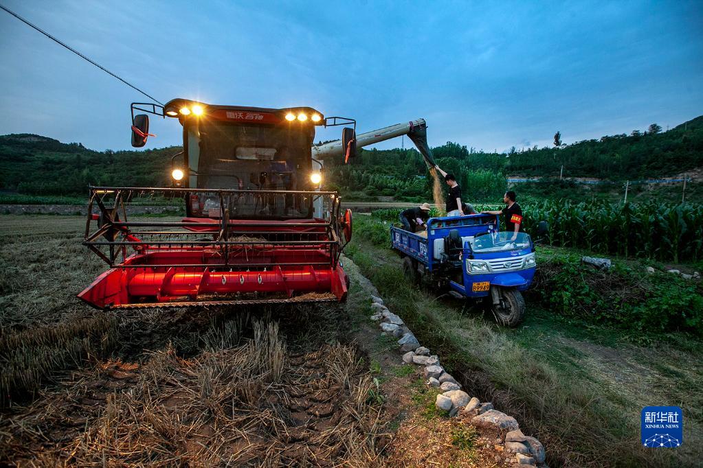 5月31日傍晚,在河南省焦作市博爱县许良镇下伏头村,村民冒着小雨抢收小麦。