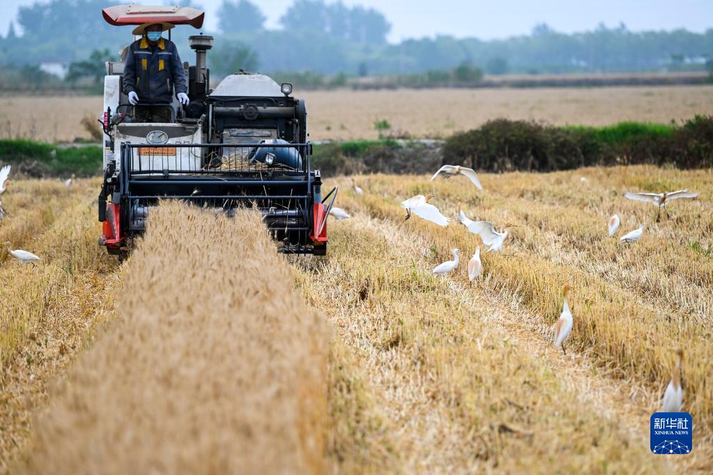 5月21日,农机手在江苏省昆山市锦溪镇三联村麦田里驾驶联合收割机收割小麦。
