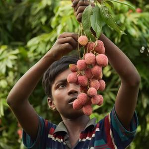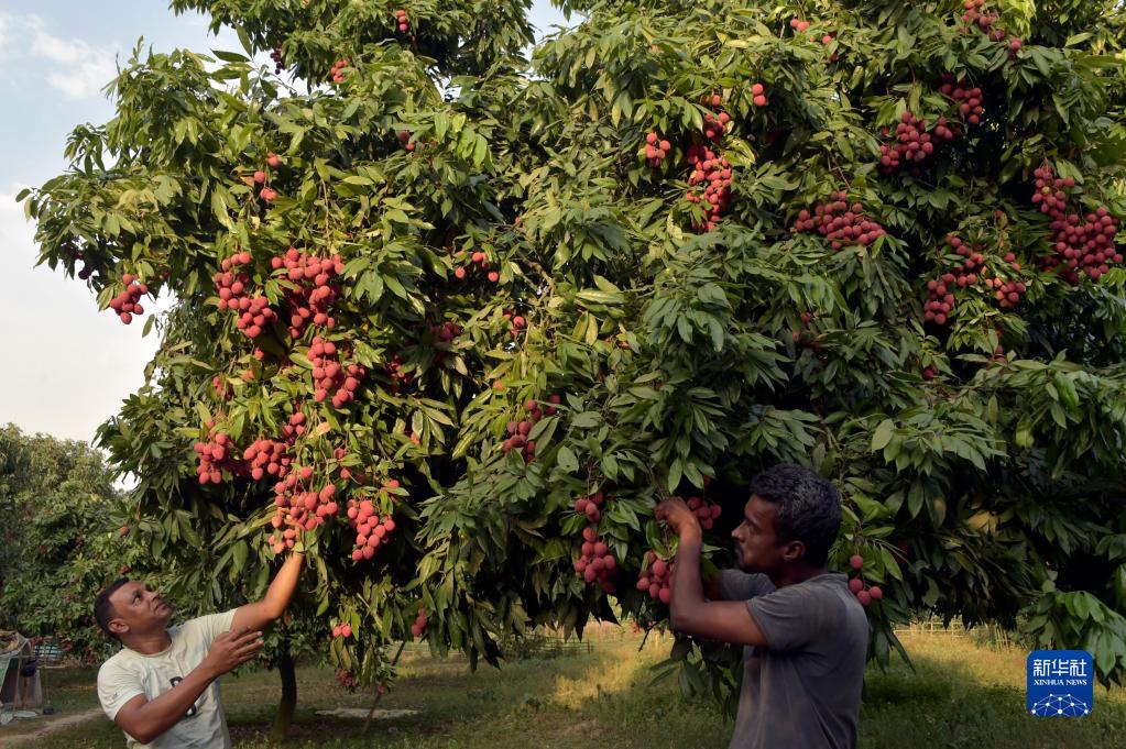 6月4日,农民在孟加拉国迪纳杰布尔的果园里采摘荔枝。