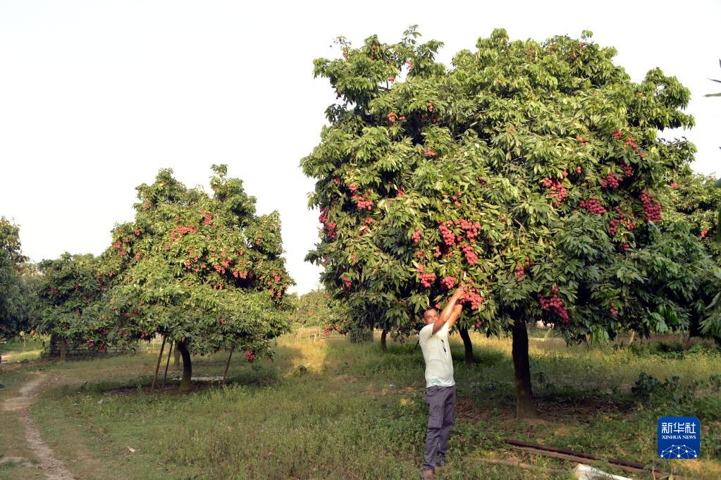 6月4日,农民在孟加拉国迪纳杰布尔的果园里采摘荔枝。