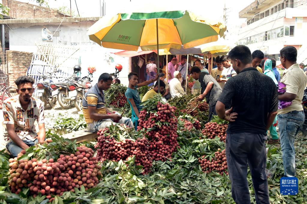 这是6月4日在孟加拉国迪纳杰布尔市场中拍摄的待售的荔枝。