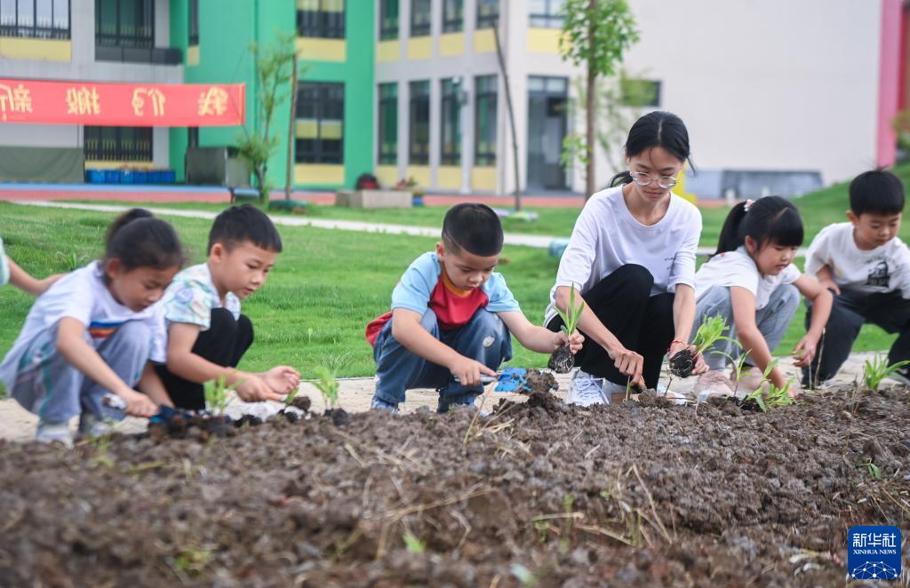 6月6日,孩子们在幼儿园的“农耕园”里跟着老师一起种玉米苗。