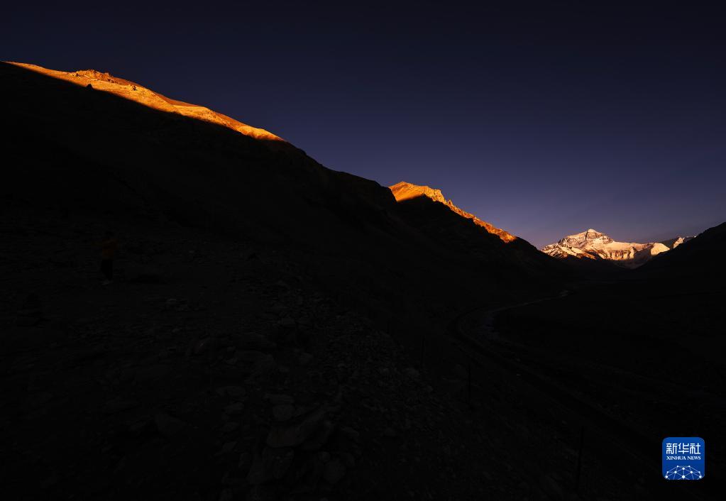 巍峨的珠穆朗玛峰屹立于青藏高原,珠峰地区气候复杂,景色瞬息万变。“国道之行 从雪山奔向大海”报道组在落日时分来到珠穆朗玛峰脚下,记录下世界之巅的“日照金山”壮美场景。