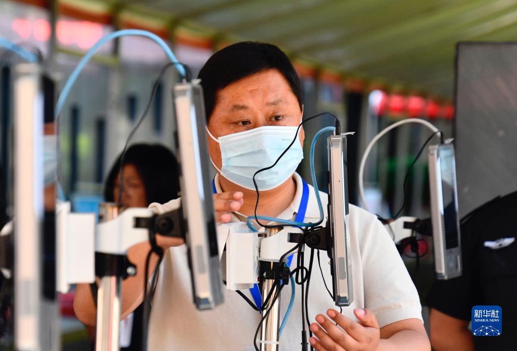 6月6日,北京育英中学工作人员在检查高考入校识别设备。