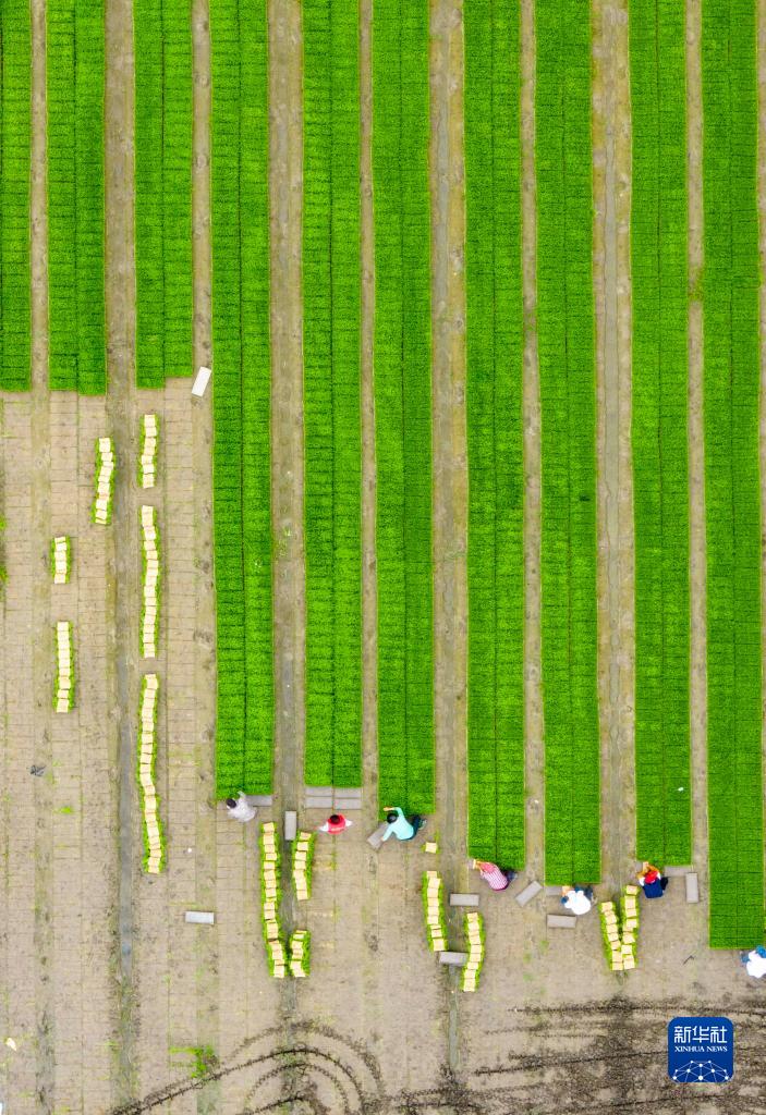 6月6日,村民在泰州市姜堰区顾高镇塘桥村起秧苗(无人机照片)。