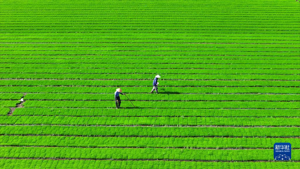 6月6日,江苏省淮安市洪泽区岔河镇东陈村农民在育秧基地管护秧苗(无人机照片)。