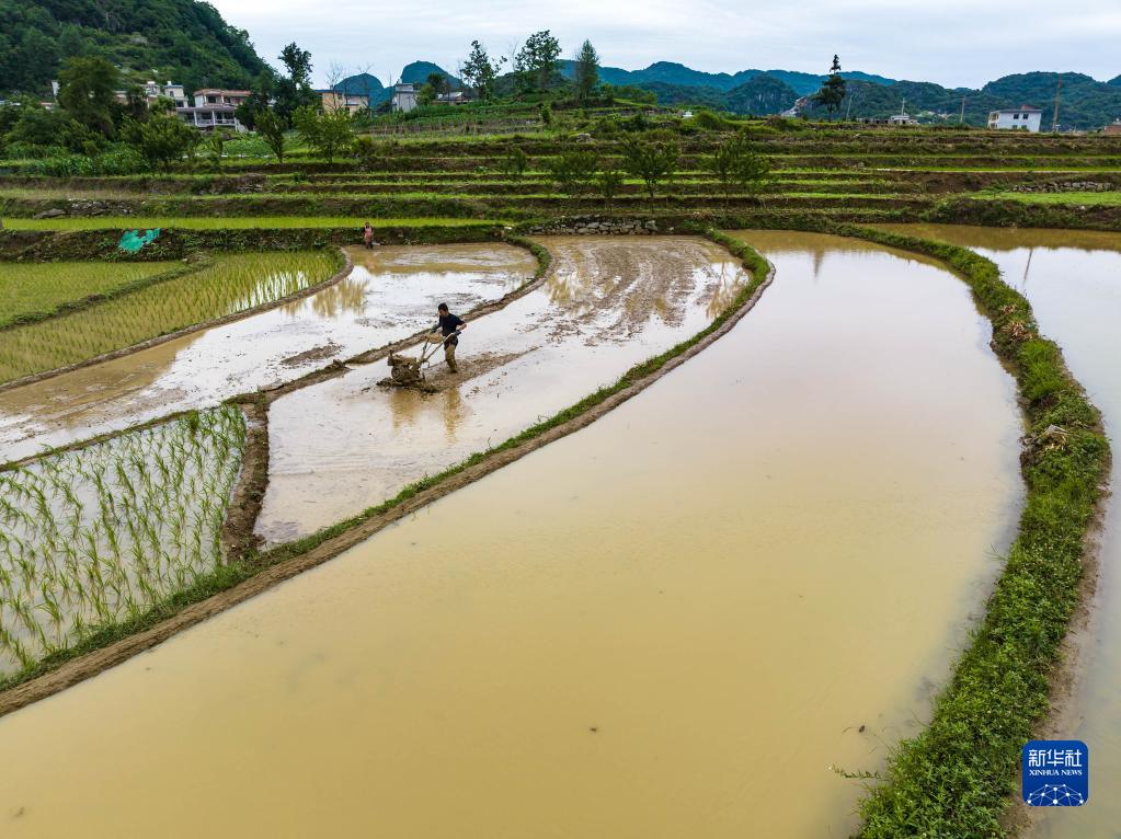 6月6日,农民在贵州省安顺市西秀区七眼桥镇九龙屯村翻耕水稻田(无人机照片)。