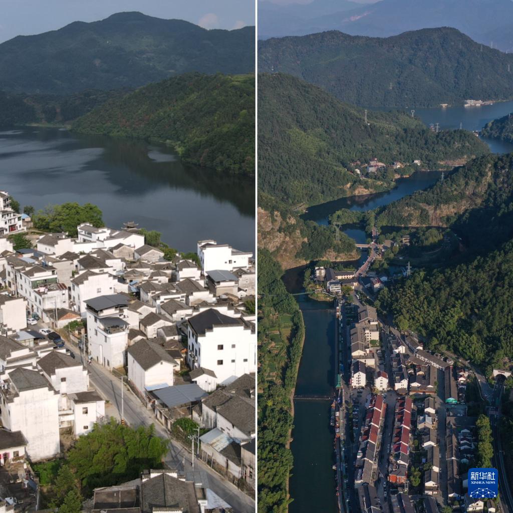拼版照片:左图为6月1日拍摄的安徽省黄山市歙县新安江风景(新华社记者张端摄);右图为2020年9月6日拍摄的浙江省桐庐县芦茨村一景(无人机照片,新华社记者黄宗治摄)。