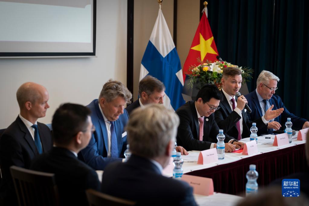 6月5日,芬兰通力集团副董事长尤西·赫林(右二)在芬兰赫尔辛基举办的以“回顾中芬互利合作70年,携手面向未来”为主题的研讨与庆祝活动现场发言。