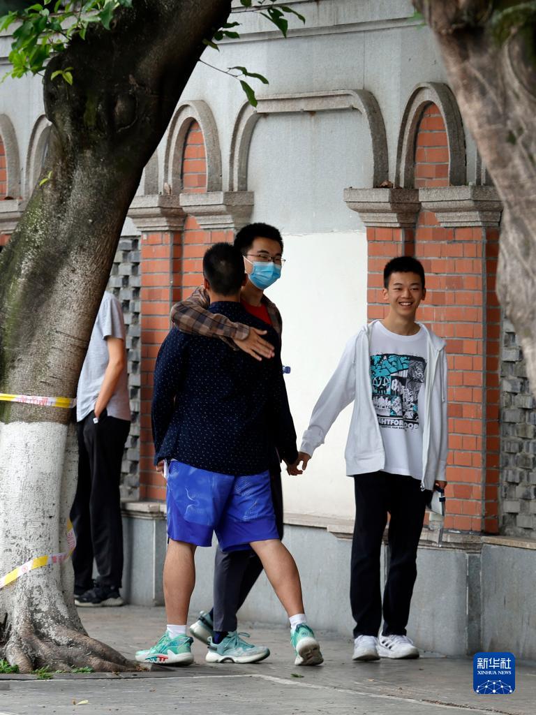 6月7日,在四川省成都市第七中学林荫校区考点外,学生互相加油鼓劲。