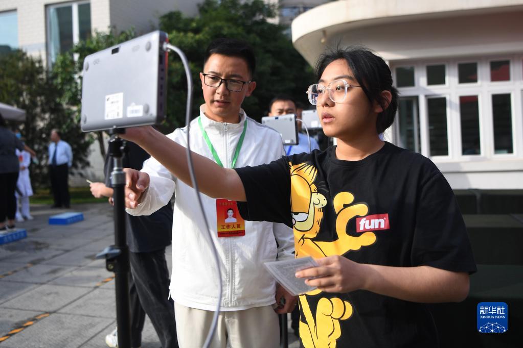 6月7日,在甘肃省兰州市第十四中学考点,考生刷身份证进入考场。