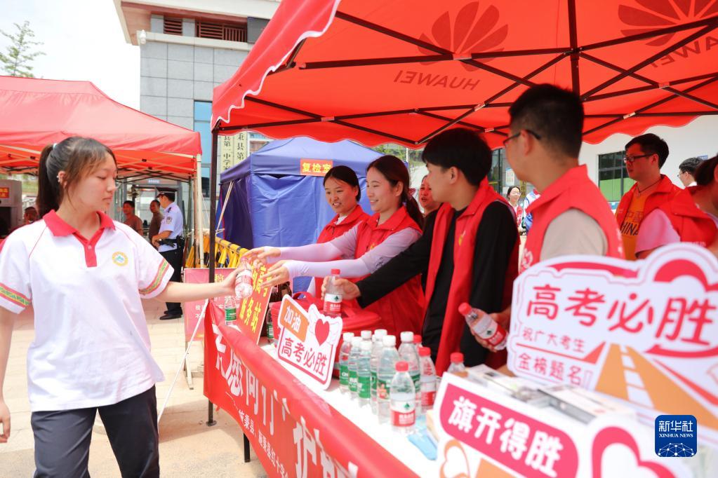 6月7日,在贵州省黔东南苗族侗族自治州施秉县第一中学考点,护航高考服务站的志愿者为结束第一场考试后走出考场的考生送矿泉水。